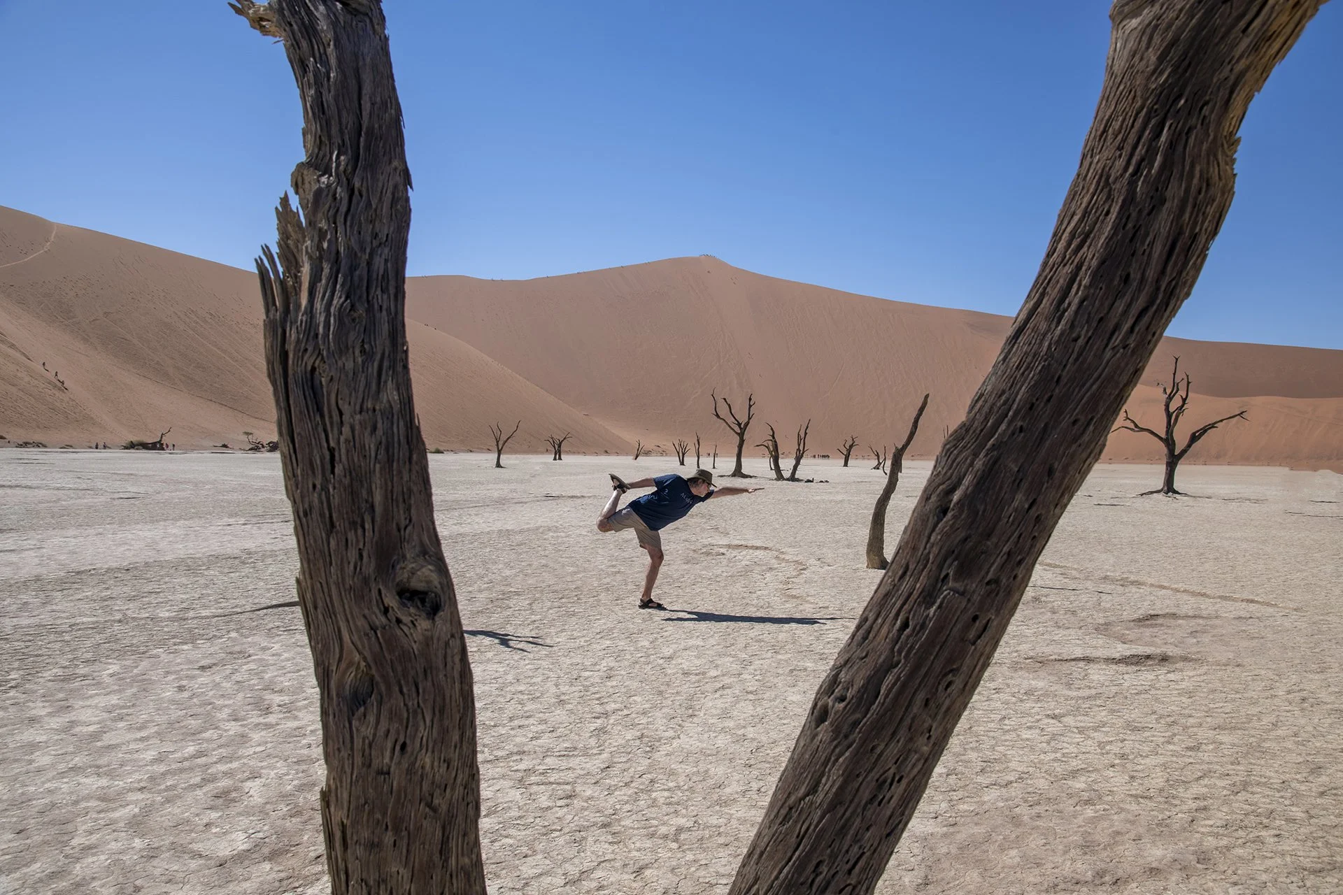 Yoga in the world’s oldest desert. Sossusvlei dry ancient lake bed, Namib-Naukluft National Park, Namibia, October 2025. Photo by Jason Larson