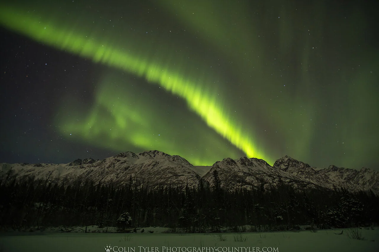 Aurora borealis over the Chugach Mountains, Eagle River Nature Center