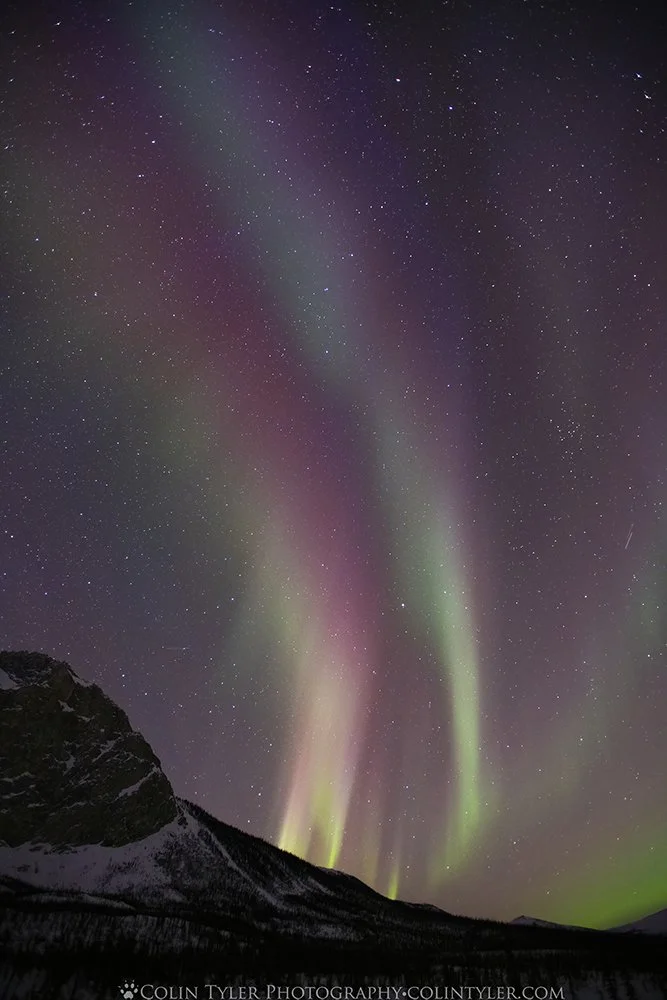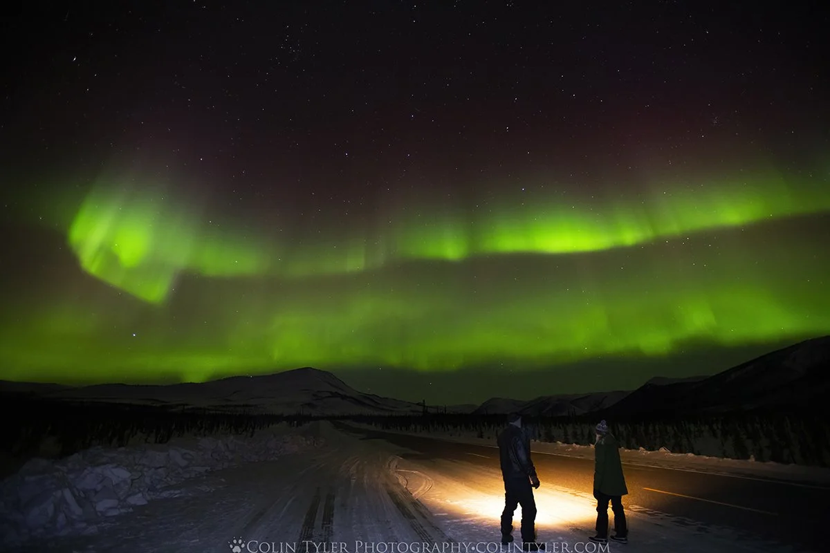 A dirty Four Runner with spare fuel strapped to the top is a sign of a good road trip. Early morning aurora dances over Dillon Mountain