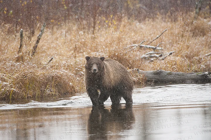 Today's wintry weather didn't keep this bear from getting a daily meal of salmon, nor was it inclement enough to keep me from missing a unique photographic opportunity.