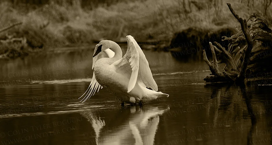 This pair of trumpeter swans has been here for over two weeks now, allowing me to spend quite a bit of quality time with them. After taking hundreds of photos, the challenge is to consistently come up with something new and innovative. By studying their behavior and combining elements in the surrounding environment, I was able to create a unique composition this morning.