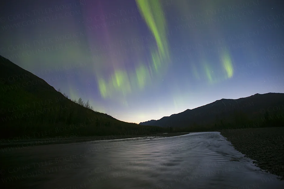 Apparently the aurora-chasing season isn't quite over yet! We had a nice display around 1:00-1:30 this morning and I was set up in a new location across Eagle River Valley. The window of viewing opportunity is narrow right now, with only a few hours of semi-dark skies. In just a matter of days, the nighttime sky will be too bright to view them again until late summer. I was wading in Eagle River here, shooting straight down the valley to the northwest. As you can see, the twilight is still glowing well after sunset.