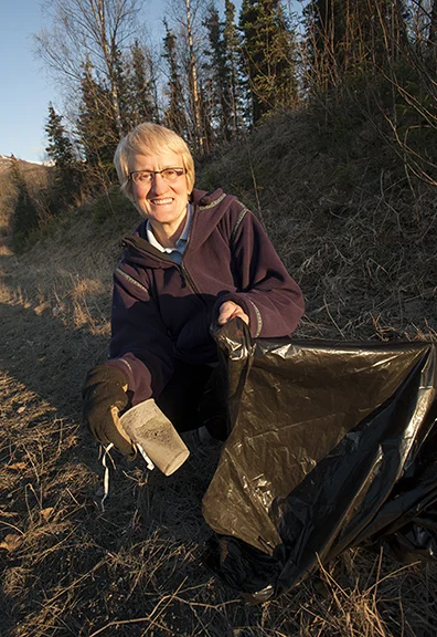 Meet Dr. Beth Baker - pulmonary specialist, dog musher, adventurer, musician, world traveler, ornithology expert and all around incredible human being. She volunteers here at the Eagle River Nature Center - Volunteer of the Year in 2010, as a matter of fact, and if you were at our "Evening with the Stars" event back in February, you heard her playing the harp during dinner. On my way home from Anchorage last night I noticed a person cleaning trash on the roadside when I exited the Glenn Highway, as I drove past I realized it was Beth. Immediately I pulled over to talk with her and learned that she collects 20 bags of trash per year along this route, on her own volition. She has not “adopted” this section of highway nor does she seek recognition for her efforts, she simply does her part to make the world a better place.