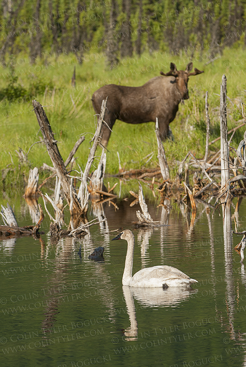 There are days when everything lines up for me, quite literally. In this case, it was a trumpeter swan and a bull moose in the same frame. First I saw the swan, which was surprising since I have not seen one here in Eagle River Valley since April 10 of this year. As I was photographing the swan I heard something crashing in the distance, which caught both of our attention. Shortly thereafter the moose came into view, walked along the water’s edge and stopped right behind the swan, setting up a rare photo opportunity. In the midst of all this a pair of greater yellowlegs flew onto the scene but I politely told them they would to have to wait their turn to be photographed.