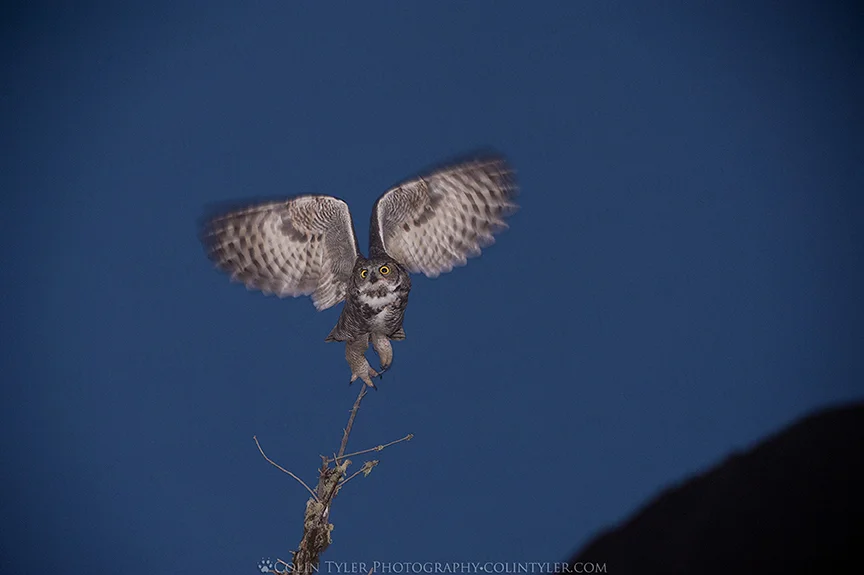 For the past couple weeks, both morning and night, under varying light and backgrounds, I have been trying to capture an image of a great-horned owl taking flight. Focusing on a bird in flight is challenging enough in broad daylight but when the sunlight has retreated and your subject is nothing more than a silhouette against a cobalt sky, it is quite literally a shot in the dark.