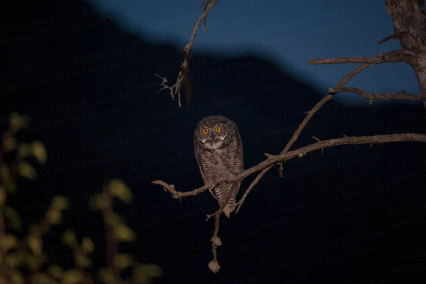 I’ve been spending a fair amount of time with this pair of great-horned owls recently. They’ve allowed me to get quite close, although they are primarily nocturnal and seem to appear just after sundown, making them difficult to photograph. Last night I decided to add a bit of light by mounting a flash and bounce card/diffuser on my camera. Since their eyesight is keen in the dark, I was concerned that the bright light may harm their vision or cause temporary blindness. I did some research and from what I gathered, owls do not seem to be affected by bright light sources and often use outdoor floodlights to their advantage when hunting. Since the sun had just set, there was still a bit of ambient light and I was at least 50 feet away. They would look directly at me while the flash fired multiple times and then fly to another tree seemingly unaffected.
