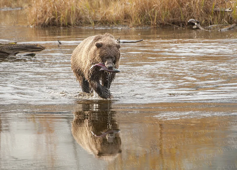 I have to marvel at this young brown bear, who just one month ago would clumsily splash around the creek in an attempt to catch salmon without any success, was able to pick up 3 in less than an hour yesterday. Winter is going to be bit easier now that she is fattening up. This is another shot from yesterday’s fall color photography class at the Nature Center. We were very fortunate to have this opportunity.