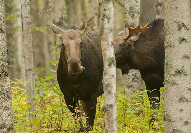 Love is in the air!! It sure was for this bull moose today, anyhow. I spotted the cow this morning and was attempting to photograph her when this guy walked onto the scene. She continued to browse, ignoring his advances until it was clear she wasn't in the mood, at which point she could buck and run away. Watching a pair of Alaskan moose crash about right in front of you can be a bit intimidating and when the bull's body language made it clear he no longer wanted me around, I obliged and moved on. If there is one thing I've learned over the years, it's that you don't want a rutting bull moose to perceive you as competition for his girl.
