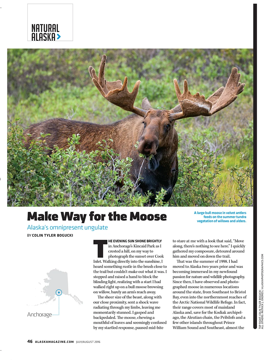I recently had the privilege of authoring an article about moose for Alaska Magazine. If you are a subscriber, you will find it in the newest July/August issue. It is also available in magazine stands throughout Alaska - you won’t miss the stunning wolf image on the cover! You can read the article here, but I would suggest picking up the latest issue and perusing the summer wildlife photo essay and other great articles, it is an excellent resource if you are planning a trip to Alaska or if you like to read about adventure and life on the Last Frontier. You can also subscribe here.