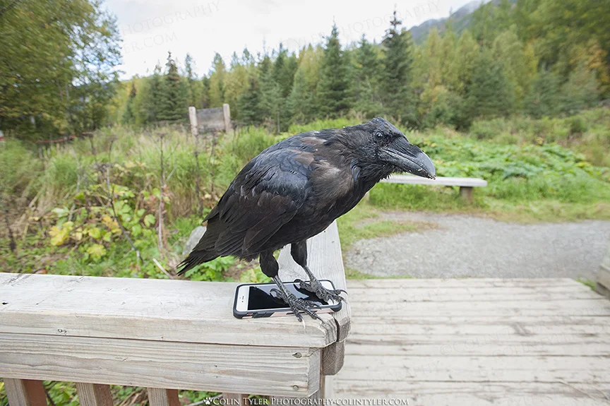 This raven was unusually curious and obviously looking for food, it's likely been conditioned to receiving handouts from people. The photo was taken with a 17mm wide-angle lens at very close range - within a couple feet. iPhone (unintentionally) provided by Jean Cheng/\.