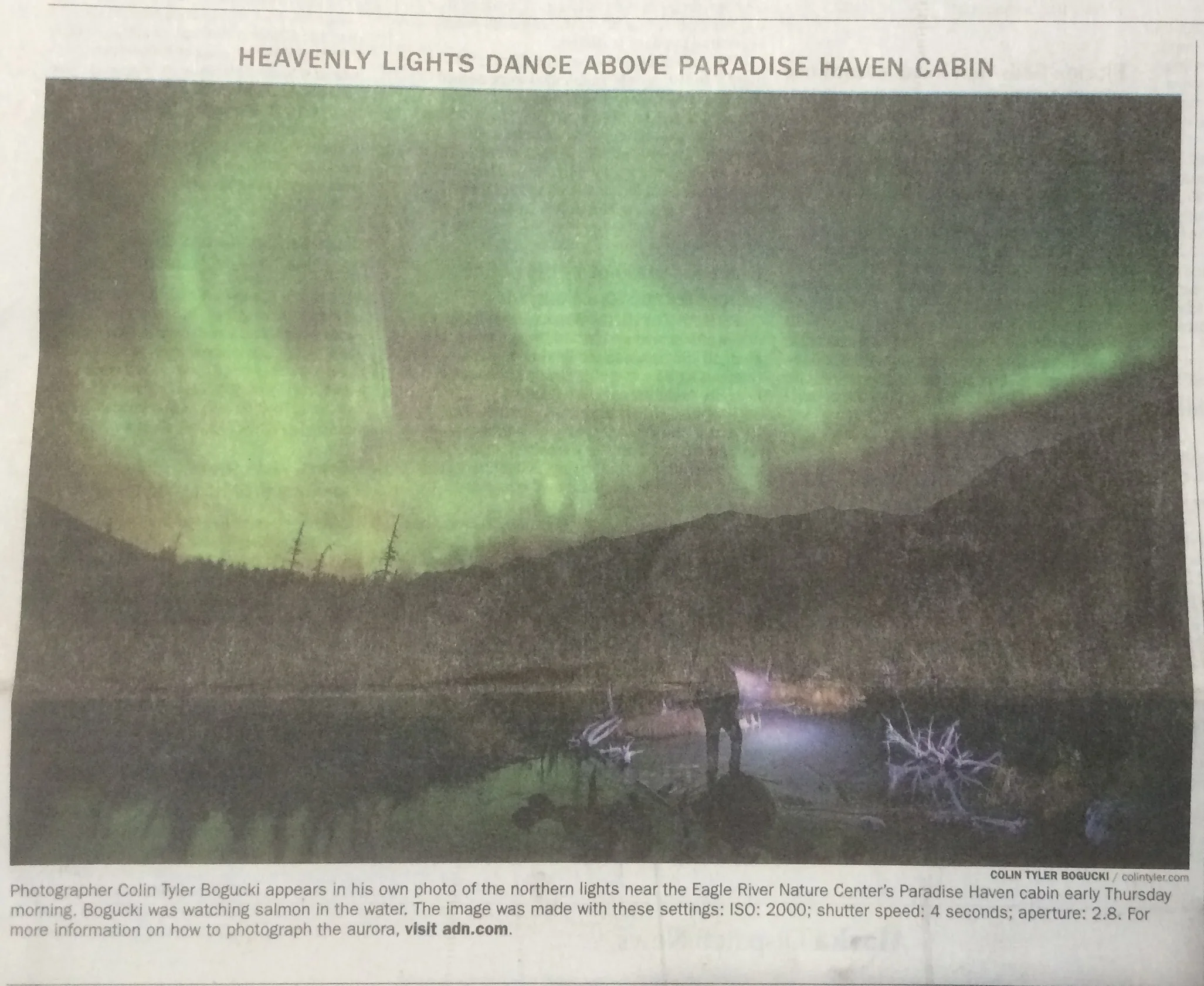 If you happened to see a copy of Alaska Dispatch News today, you may have noticed my aurora/salmon gazing self portrait from early yesterday morning on the front page...