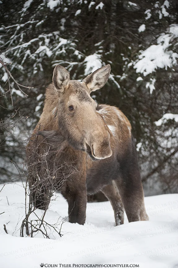 I went out skiing with my camera gear earlier today, hoping to catch a colorful morning sky. On they way to my favorite location, I came upon a cow moose browsing next to the trail. Not wanting to startle her by passing by closely or risk being charged, I skied into the trees and made a wide arc, coming back out further up the trail where I could get some photos of her. A few minutes later, another moose stepped out onto the trail and joined her. I could see that they wanted to walk the trail past me, so I stepped behind a stand of trees, allowing them to pass by safely. After they walked past, I noticed the first moose had an injured hind leg. There wasn’t an open wound but the leg was obviously deformed, probably from an injury that she acquired long ago, possibly caused by a bear. She was limping along and I can only imagine that traveling through deep snow must be very challenging for her. The experience served as a reminder that humans need to give wildlife ample space to go about their routine, for our safety and theirs. If the moose had been frightened and run off into the woods to avoid me, she would have exerted a lot of energy, a situation that could prove fatal in the dead of winter. As a wildlife photographer, the welfare of your subject should always be the top priority.