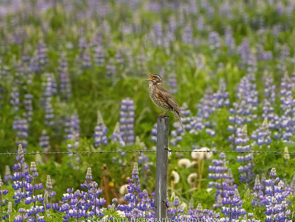 The blooming lupine is abundant in Iceland in early summer. When I saw a redwing land on this fencepost, I decided to go back later to try capture the image I had visualized. I was zoomed out to 400 mm and stopped down to f/16 to get ample detail in the lupine.