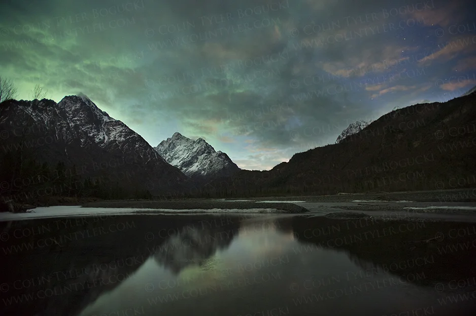 With the aurora subsiding and clouds closing in on me, I resumed the three-mile trek out to Echo Bend. I could see the sky was continuing to cloud up but since I was more than halfway to my destination, I decided to continue and if nothing else, get out of the thick forest and onto the open riverbed. It was a dark, moonless night after all and I was alone and unarmed in the heart of bear country. Arriving at the river I could see a good distance in all directions, which was somewhat comforting. With the skies socked in and no visible auroras, I kicked aside rocks and cleared a small area on the gravel bar to lie down and rest, hoping the clouds would pass.