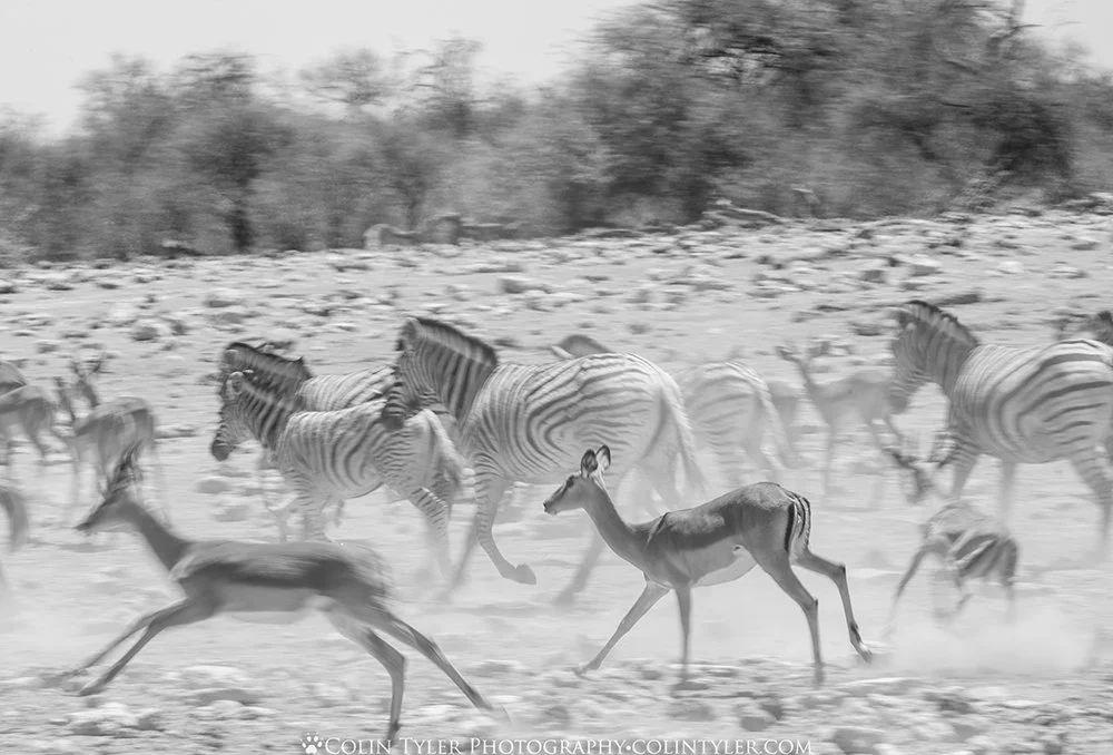 I often prefer monochromatic images when shooting in Namibia's harsh midday sun, and here I employed a panning technique to accentuate the movement and convey the chaos that ensues at the waterholes.