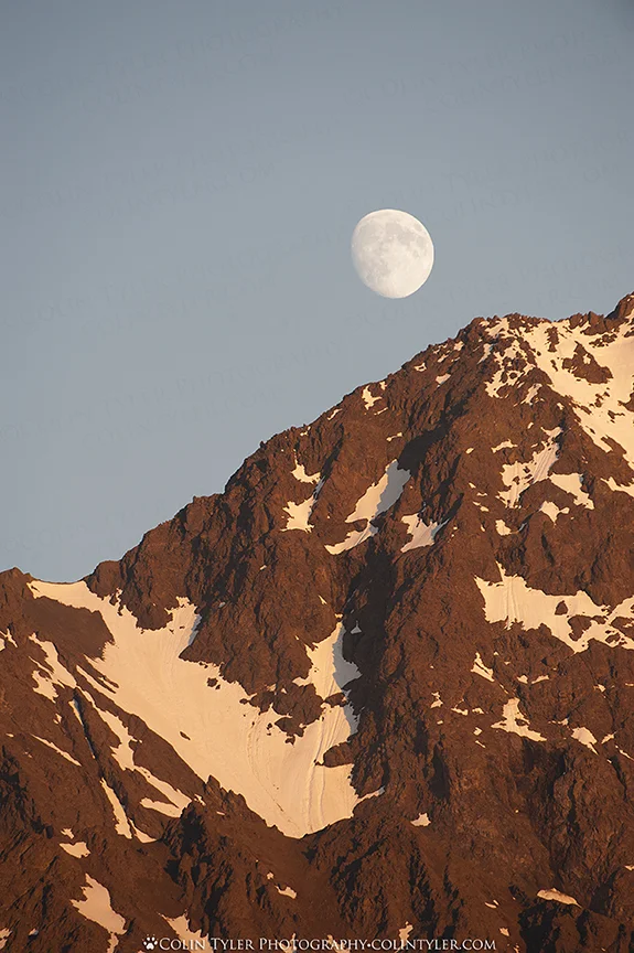 After a sunny afternoon of spring skiing in Girdwood, I decided to hang around Turnagain Arm yesterday to photograph the moonrise over the Chugach Mountains. Good thing I did, because I would later come up empty-handed from chasing the lunar eclipse. After driving home, unloading my gear and dragging my aching body into bed, I barely caught two hours of much needed sleep before my alarm woke me. I pulled myself together, grabbed my camera bag and hit the trail with a hot cup of tea in hand. I hiked out about a mile to shoot the eclipse, only to watch clouds roll in and hide the moon after I set up. C'est la vie, it was a nice night for a sleepwalk through the forest.