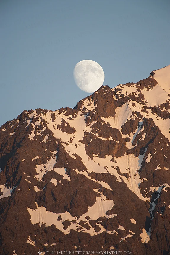 Last night's sunset moon, taken at approximately 11:15 pm. These are the longest days of the year - after next Tuesday, June 21, we will slowly start losing daylight, going from almost 19 hours of daylight to less than 6 hours by December 21. This time of year is exhausting for those of use who chase light, even the moon appeared to be taking a rest on the mountain.
