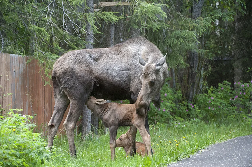 Following up on my post from two days ago regarding moose on the roadways, this morning was another reminder when a cow with two newborn calves were trying to cross the Eagle River Road. The calves either weren't able or weren't willing to make it over the guardrail, so mom kept going back to try convince them to follow her. Cars were stopped for several minutes in both directions until two vehicles pushed ahead, forcing the cow to step back over the guardrail to be with her calves, only to return to the road after they passed.