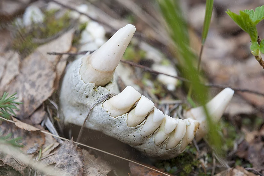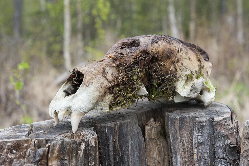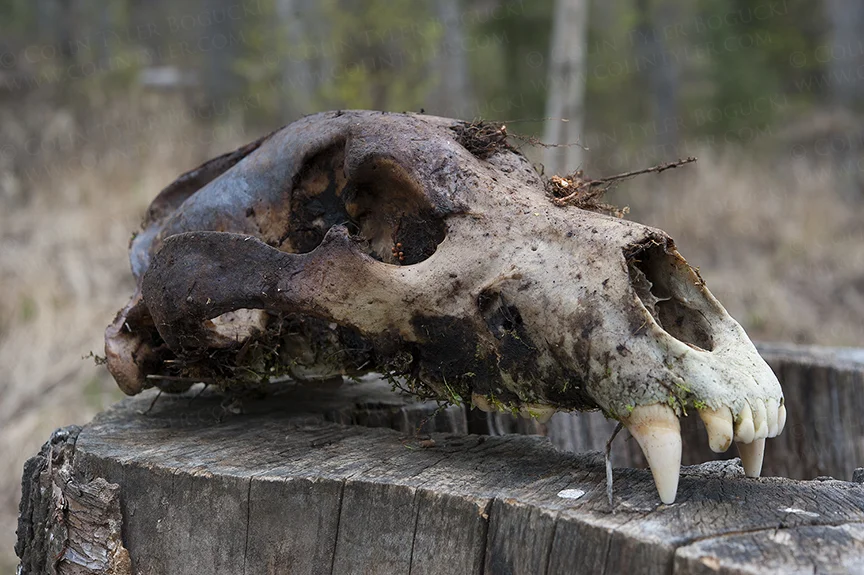 Spring reveals many things, including Mother Nature’s brutal side. If you pay attention to details, the forest floor often tells stories of seasons past, this was the case today when I discovered the remains of what appears to have been a good-sized brown/grizzly bear. Judging from how the skull had been absorbed into the earth and moss, this bear met its match a number of years ago, probably the result of fighting with another bear. Based upon the way in which the bones were scattered about, it’s also quite possible that it was cannibalized by its assailant, and so goes the circle of life.
