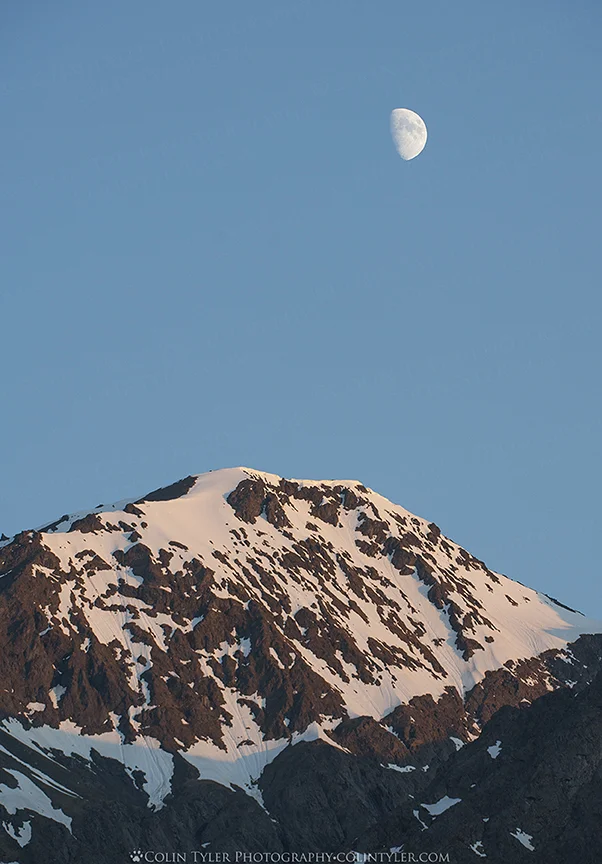 Last night's sunset moon, taken at approximately 11:15 pm. These are the longest days of the year - after next Tuesday, June 21, we will slowly start losing daylight, going from almost 19 hours of daylight to less than 6 hours by December 21. This time of year is exhausting for those of use who chase light, even the moon appeared to be taking a rest on the mountain.