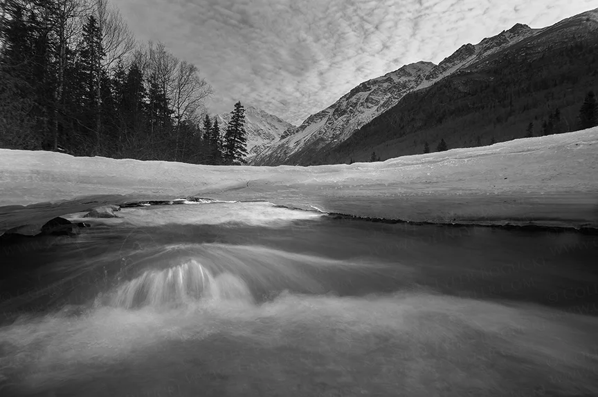 Yesterday I walked a few miles along the river, examining the receding ice. My goal was to document the changes and, more specifically, take a close look under the ice bridges, most of which have collapsed by now. I found this bridge intact with rushing water directly below and a nice view of the valley in the background, the only issue being that the water was too deep for my Xtra Tough rubber boots. Determined to get the shot and set up just above the surface of the water, I removed my boots, pants, and thermal layer and waded into the icy water barefooted, repeatedly telling myself that it really isn’t that cold. In the end, it really wasn’t too bad and I came away with a unique perspective of the river and the valley.