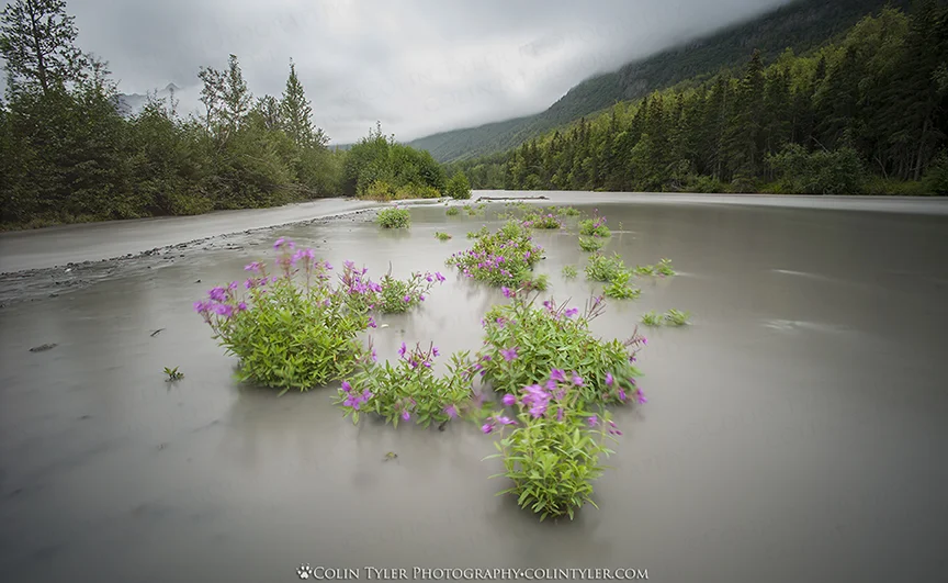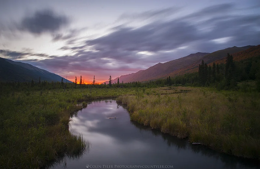 Day 2, Crow Pass Trail with Tyler Howie. Without time for a proper breakfast, we grabbed handfuls of mixed nuts and hit the trail, trying stay ahead of the looming rainclouds that were billowing over the pass and heading our direction. After hiking all day and stopping periodically to satiate on ripe blueberries, we reached the point where we were to cross Eagle River only to be greeted by these two sparring bull moose, exactly where we needed to be. After observing and photographing them, they crossed the river and chose to hang out on the opposite bank, again right where we needed to cross. With darkness looming, they wandered off after a short while and we forded the river. While warming our feet from the ice-cold glacier water and sipping a cup of hot tea, the two bulls returned and drove us out of their turf. Still in my water shoes, we threw on our packs, grabbed everything that was scattered on the ground and hightailed it down the trail.