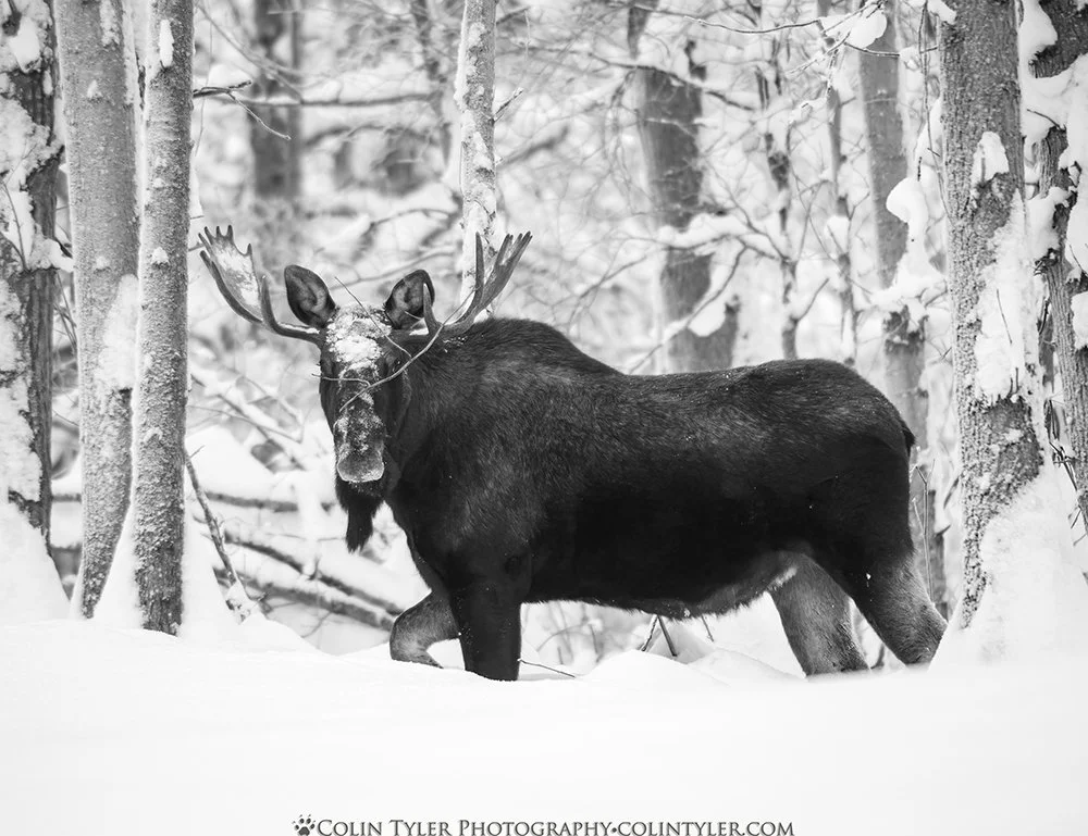 Hope everyone had a nice holiday! I was able to get outside to capture some moose photos in the deep snow (we still have close to 30" on the ground). This was one of three bulls that were feeding together and as you can see, he had a branch stuck in his headgear that wouldn't fall off. Two bulls still had their antlers and one had already shed his for the season.