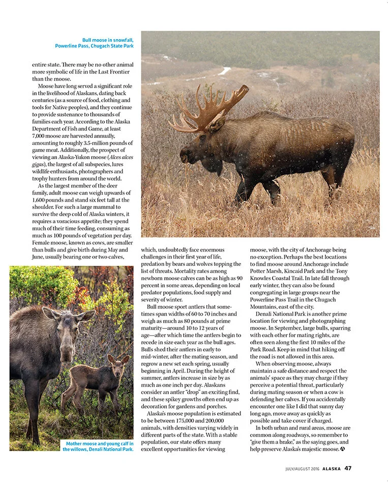 Alaska Magazine, July 2016. “Make way for the Moose: Alaska’s Omnipresent Ungulate”