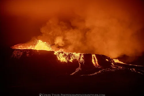 Fissure 8 glows behind the mountains, the source of the lava river.