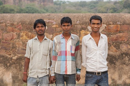 Three young men posed for a group photo at a Hindu religious festival at the Ranthambore Fort, India