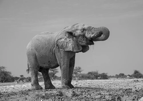 Elephant throwing mud on its body to protect from the sun, Etosha National Park, Namibia