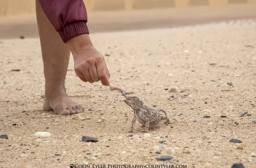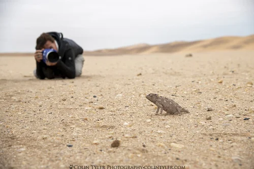Photographing a chameleon, Little Five Wildlife Tour, Swakopmund, Namibia