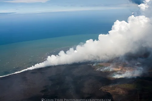 Hot lava hits the ocean and cools, creating new land. When I was there, more than 700 new acres of land had been created from the lava. Similarly, more than 700 homes had been destroyed.
